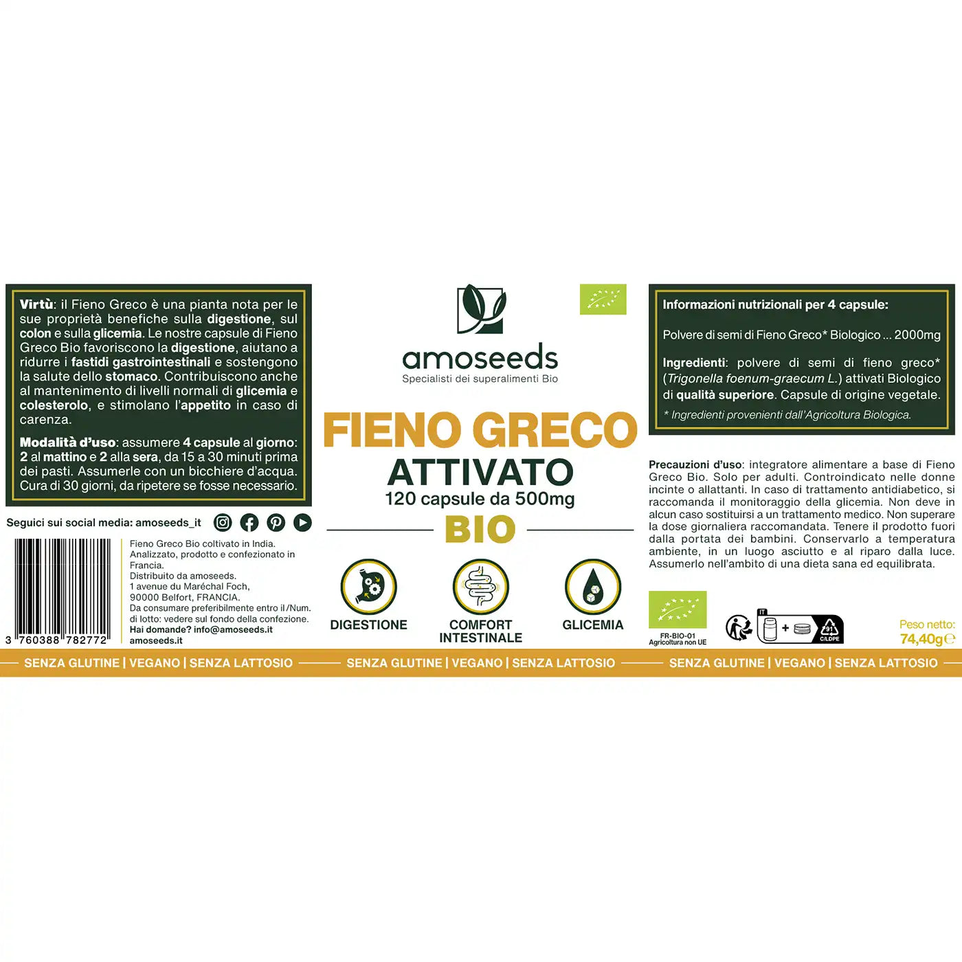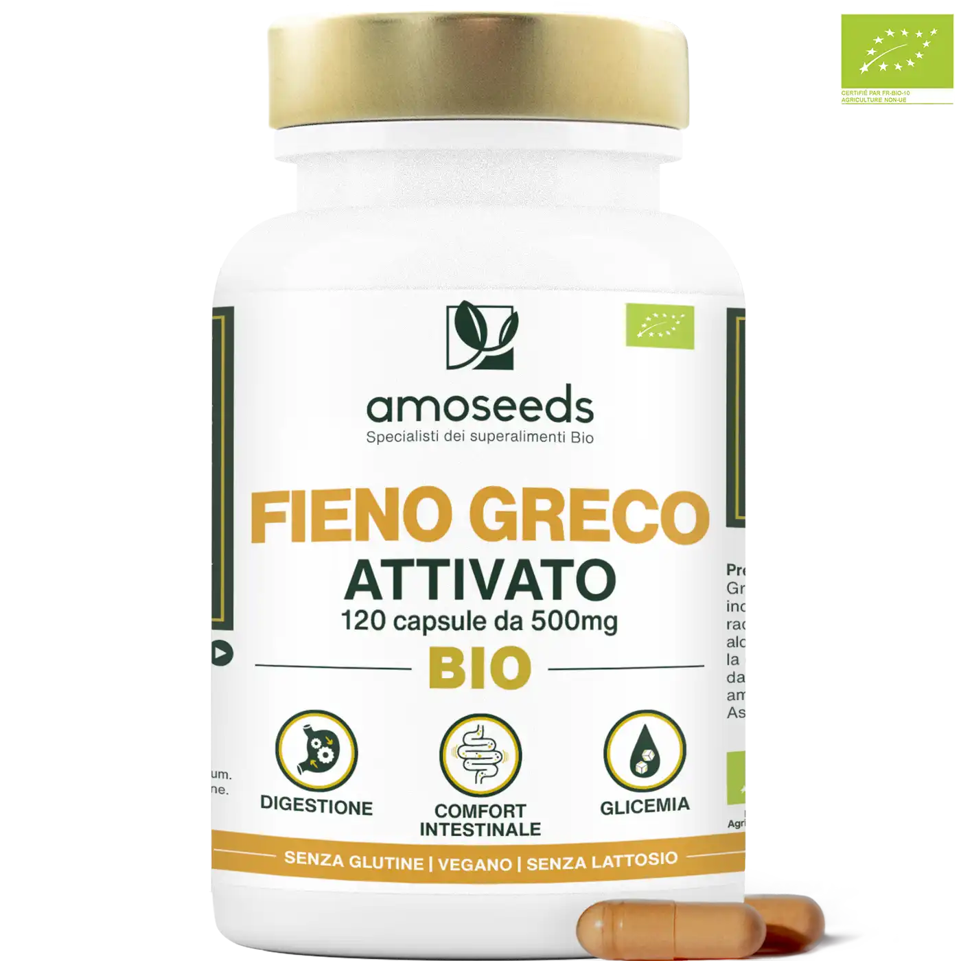 CERTIFICAZIONE BIOLOGICA: scatola riciclabile e richiudibile da 120 capsule contenenti 500mg di polvere di semi di fieno greco attivati Biologici di qualità superiore. Prodotto 100% puro, vegano, senza additivi, senza conservanti, senza OGM, senza pesticidi, senza coloranti artificiali, senza glutine e senza lattosio. Ogni lotto è testato da terzi per garantirne qualità e purezza. Semi di fieno greco coltivati in India. Prodotto analizzato, fabbricato e confezionato in Francia.