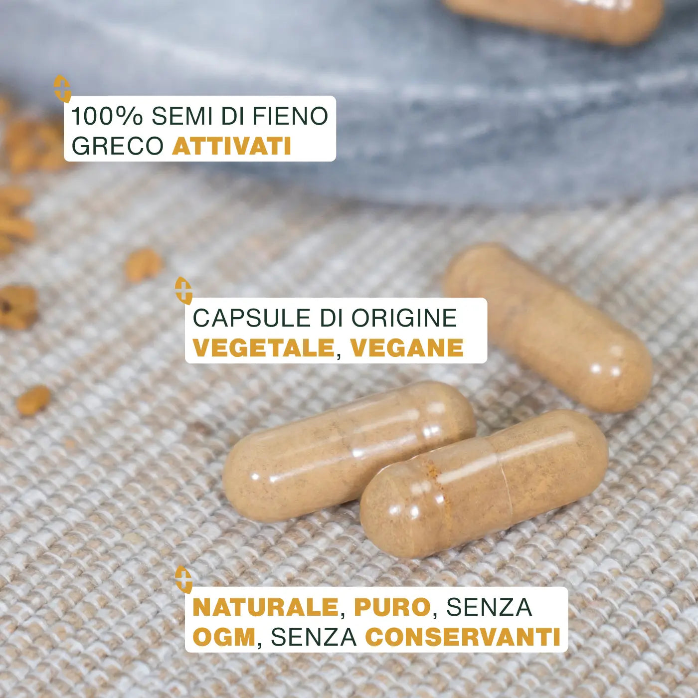 Ingredienti: 100% polvere di Fieno Greco (Trigonella foenum-graecum L.) attivato biologico di qualità superiore. Capsule di origine vegetale, vegan.