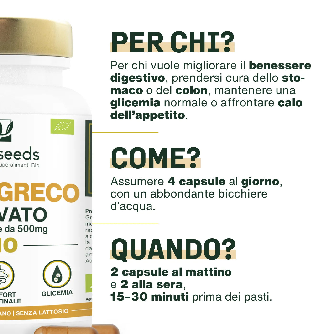 FIENO GRECO ATTIVATO, MASSIMA EFFICACIA: per garantire un integratore efficace, sicuro e ad alta concentrazione, utilizziamo esclusivamente semi di fieno greco “attivati”. Questi vengono sottoposti a un processo di ammollo e germinazione, quindi essiccati a bassa temperatura e ridotti in polvere. Questo metodo preserva al meglio le proprietà nutrizionali dei semi e in particolare le saponine, i composti attivi più ricercati in essi contenuti. La polvere ottenuta viene poi incapsulata in capsule vegetali, pratiche e facili da assumere ogni giorno.