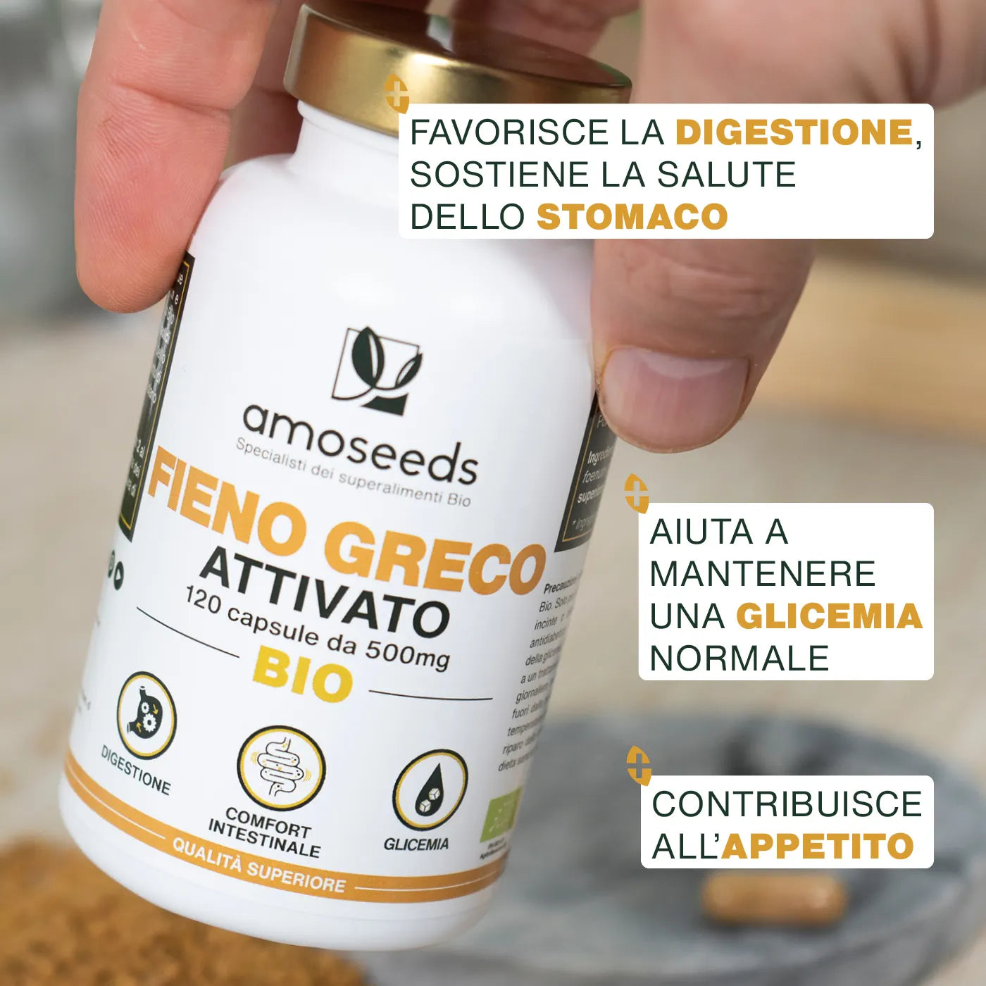 STIMOLAZIONE DELL’APPETITO: oltre ai benefici digestivi, le nostre capsule di Fieno Greco Bio sono note per le loro proprietà aperitive. Il leggero gusto amarognolo del fieno greco contribuisce a stimolare l’appetito, soprattutto in caso di inappetenza passeggera legata a una digestione difficile o a uno stato di stanchezza generale.