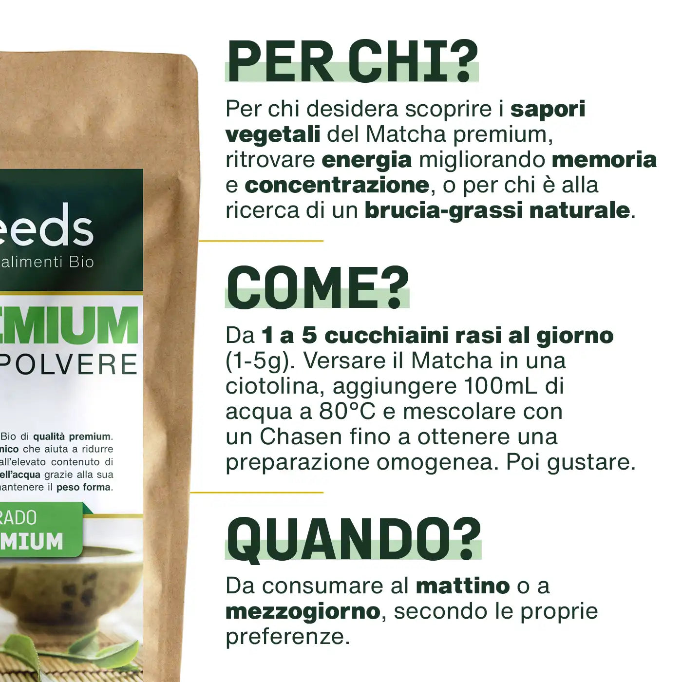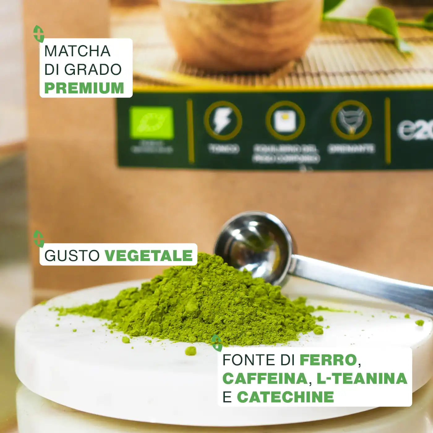 CERTIFICAZIONE BIOLOGICA: bustina Kraft richiudibile e riciclabile di 70g di polvere di foglie di Tè Matcha Premium giapponese biologico di qualità superiore. Prodotto 100% naturale, puro, vegano, senza additivi, senza conservanti, senza OGM, senza pesticidi, senza coloranti artificiali, senza lattosio, senza soia e senza glutine. Ogni lotto è testato da terzi per garantirne qualità e purezza.