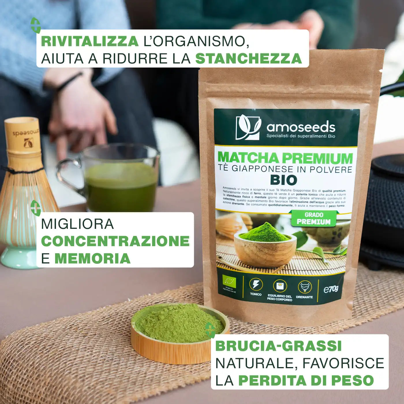 ENERGIA, TONO: naturalmente ricco di ferro, il nostro Tè Matcha Premium Bio ha proprietà rivitalizzanti che rinvigoriscono il corpo in profondità. Agisce come un tonico naturale, aiuta a ridurre la stanchezza fisica e mentale, contribuendo a rafforzare l'organismo e a migliorare le prestazioni. Se consumato regolarmente fornisce l'energia necessaria per iniziare la giornata col piede giusto e senza stanchezza. Ideale per migliorare la produttività e consigliato a chiunque desideri aumentare la vitalità.